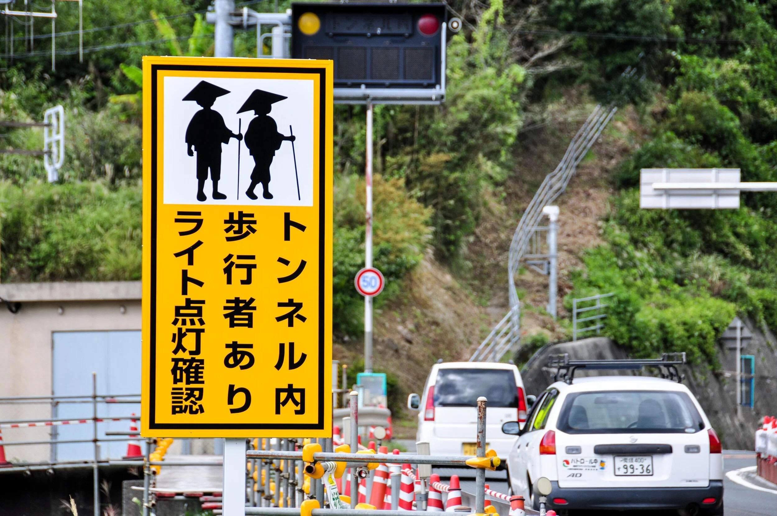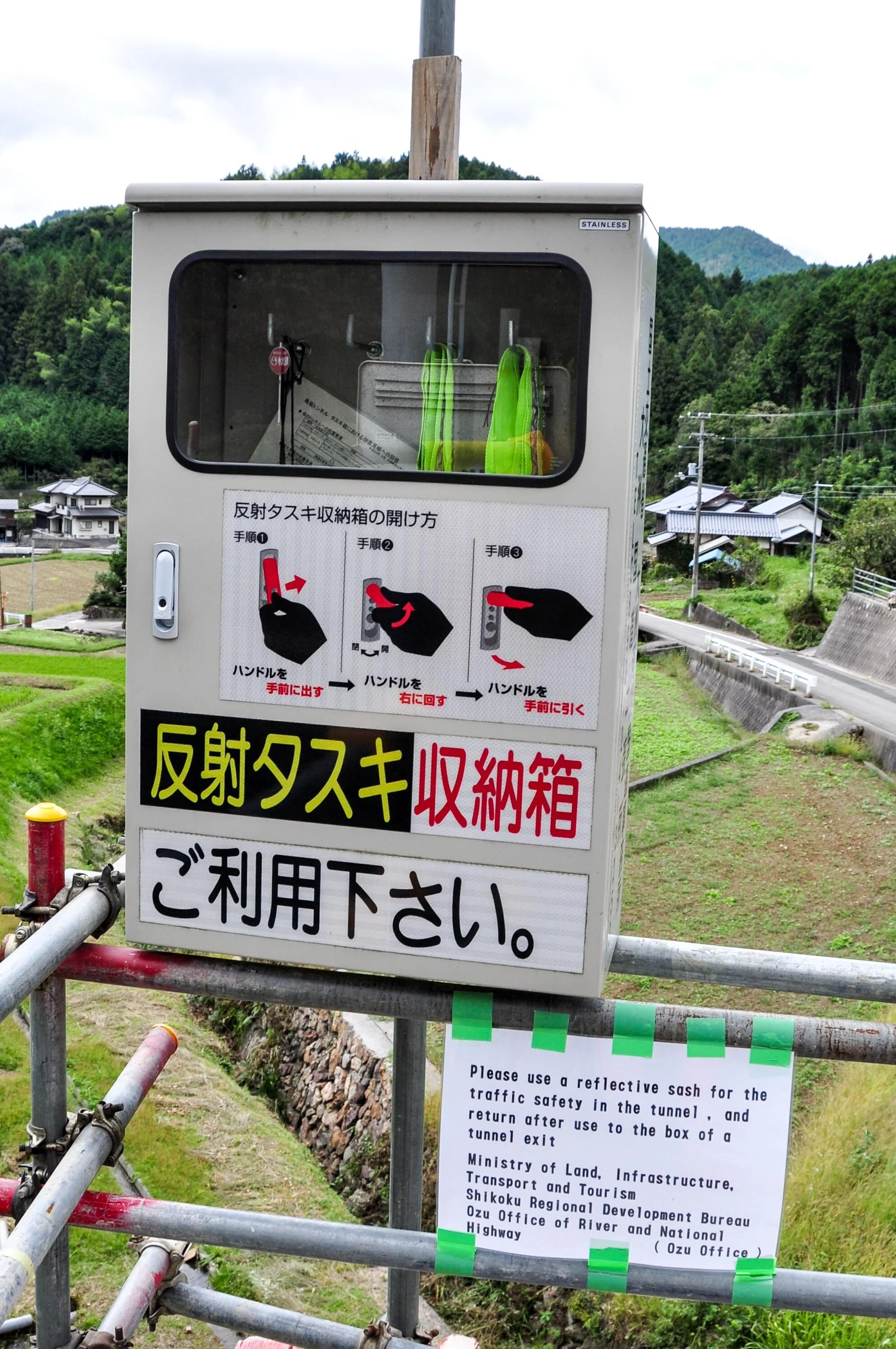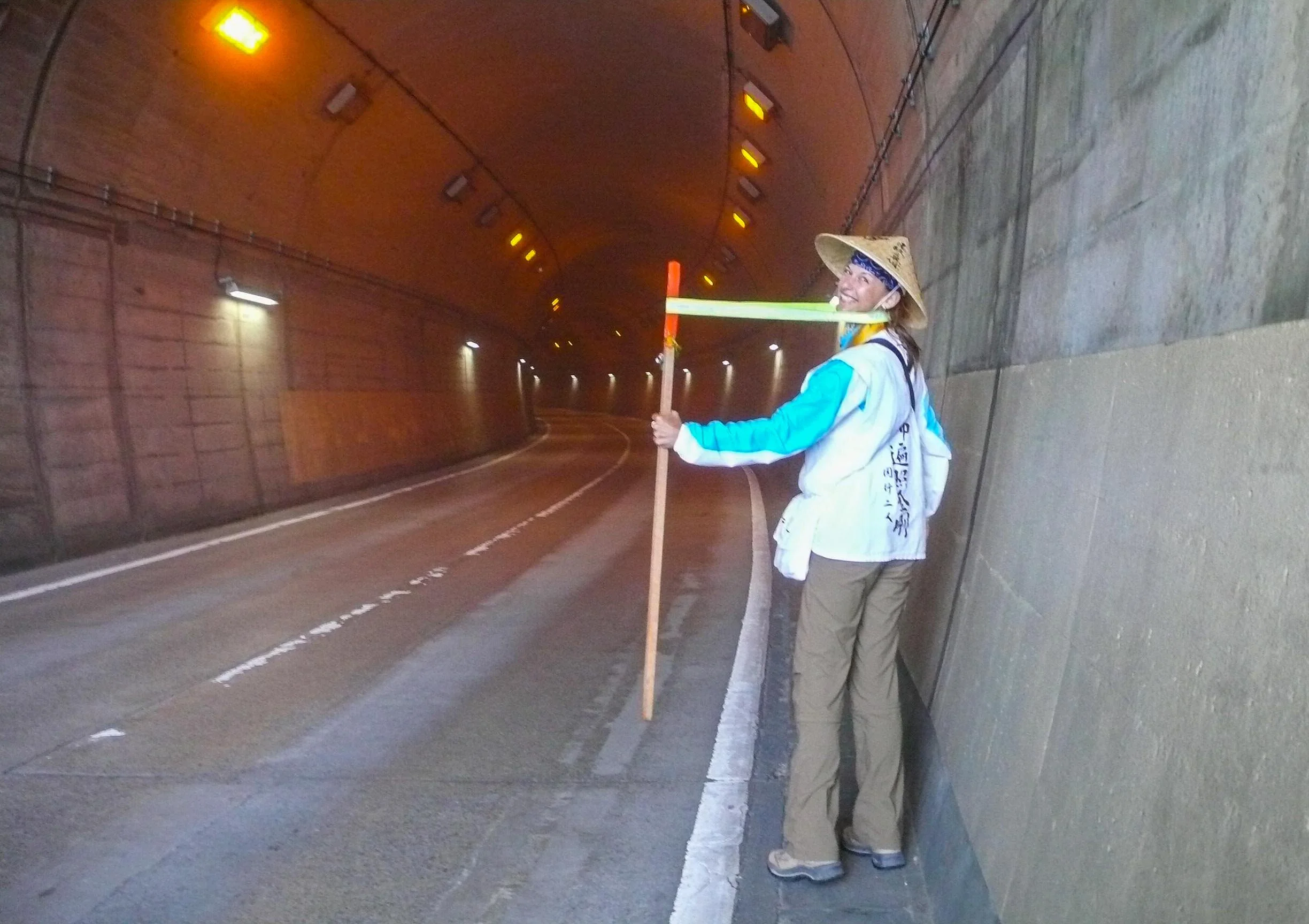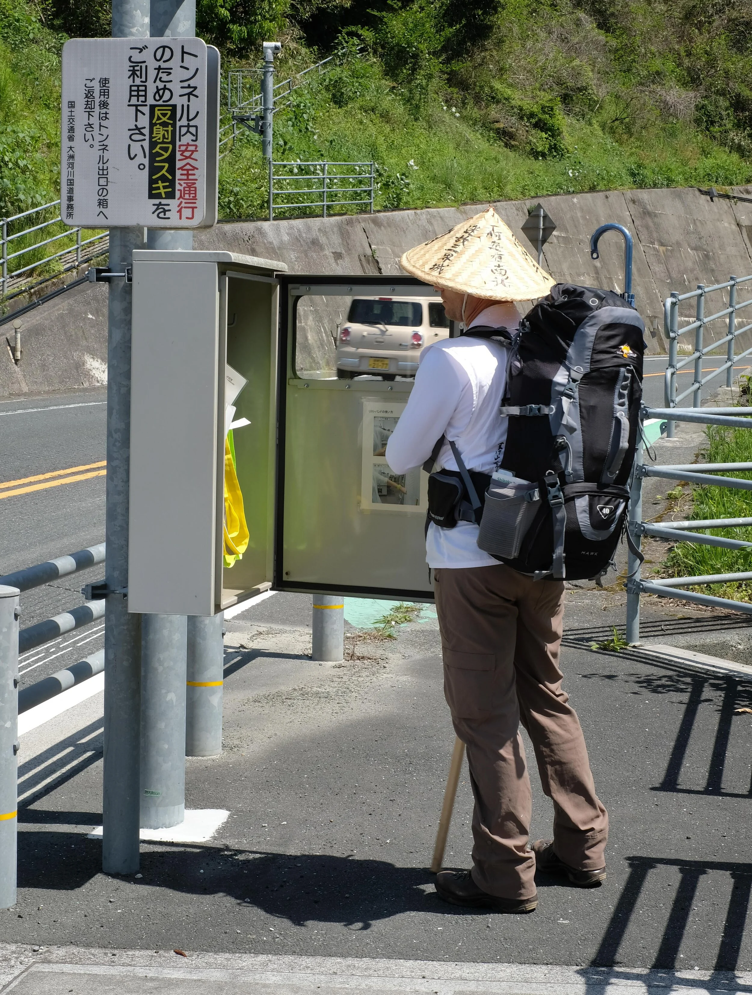 Further up the route a tunnel and a decision. At one kilometer this long tunnel would be faster. At three kilometers, the mountainous climb around the tunnel would be harder. My vote was for tunnel. Matt the climb. A coin toss would decide. Heads! Tunnel wins. This would be our first tunnel station of the pilgrimage. There is protocol for these long, dark, heavily trafficked tunnels. On each side is a metal box containing a sign in book and reflective bands. On one side pilgrims take a band and register their names inside the book. Once through the tunnel the bands get returned to a similar box. Once across pilgrims leave their ofuda (name cards) in the box as a thank you for safe passage.