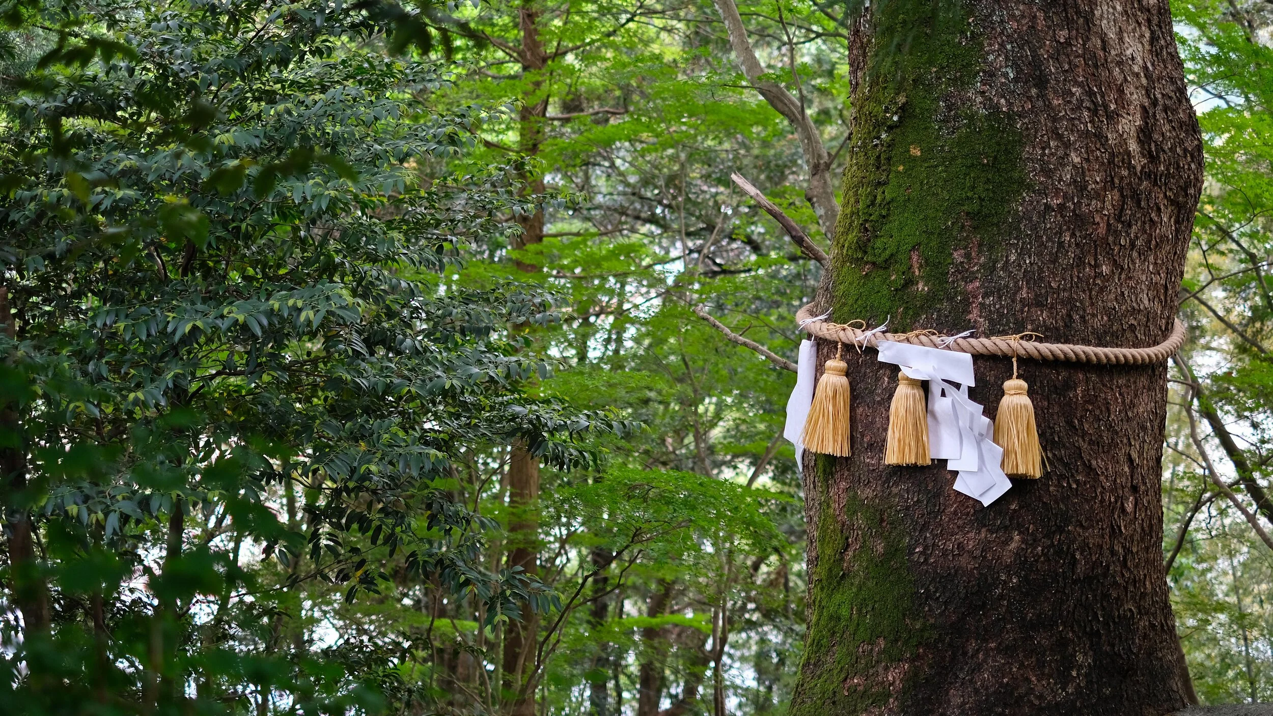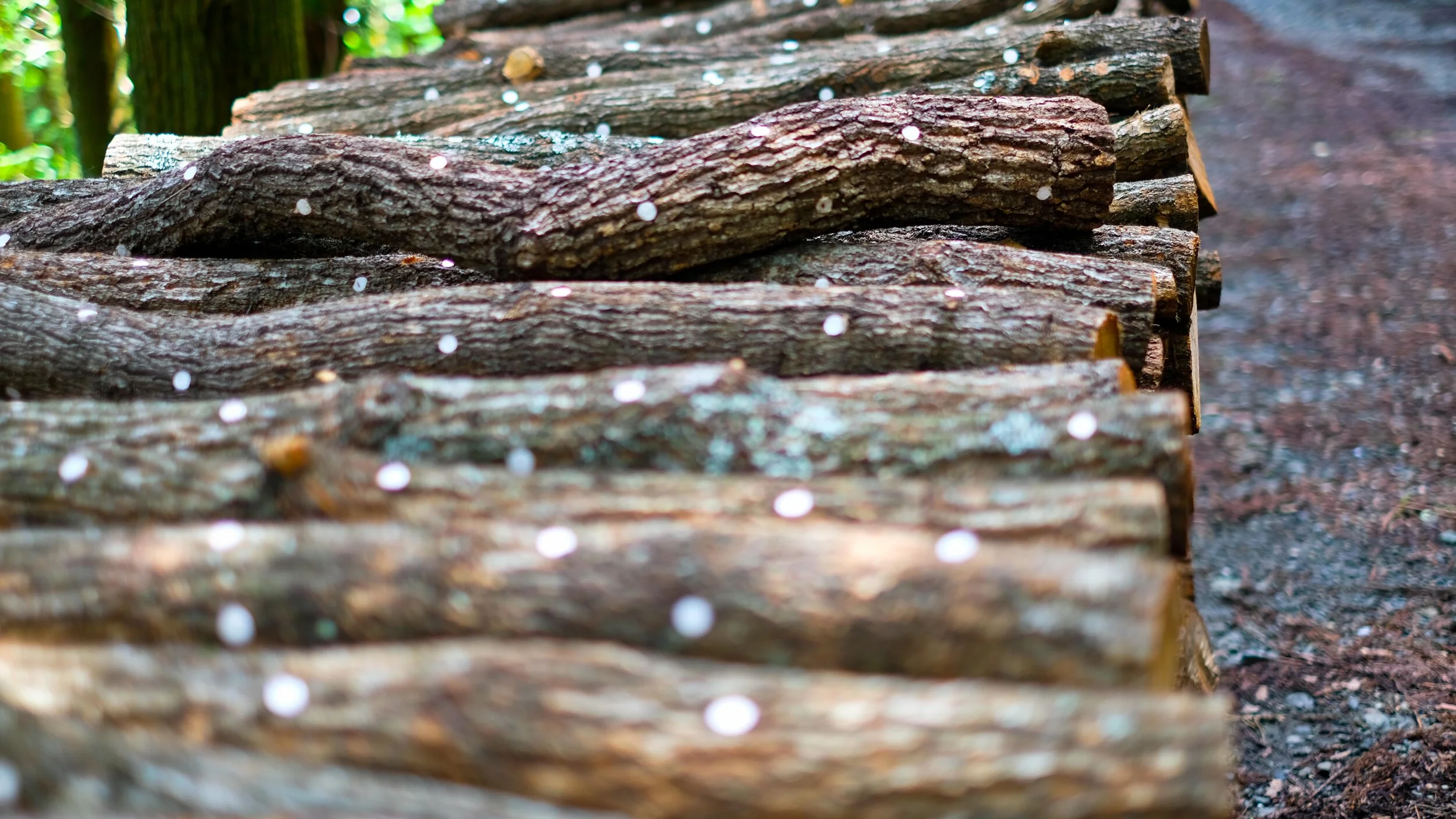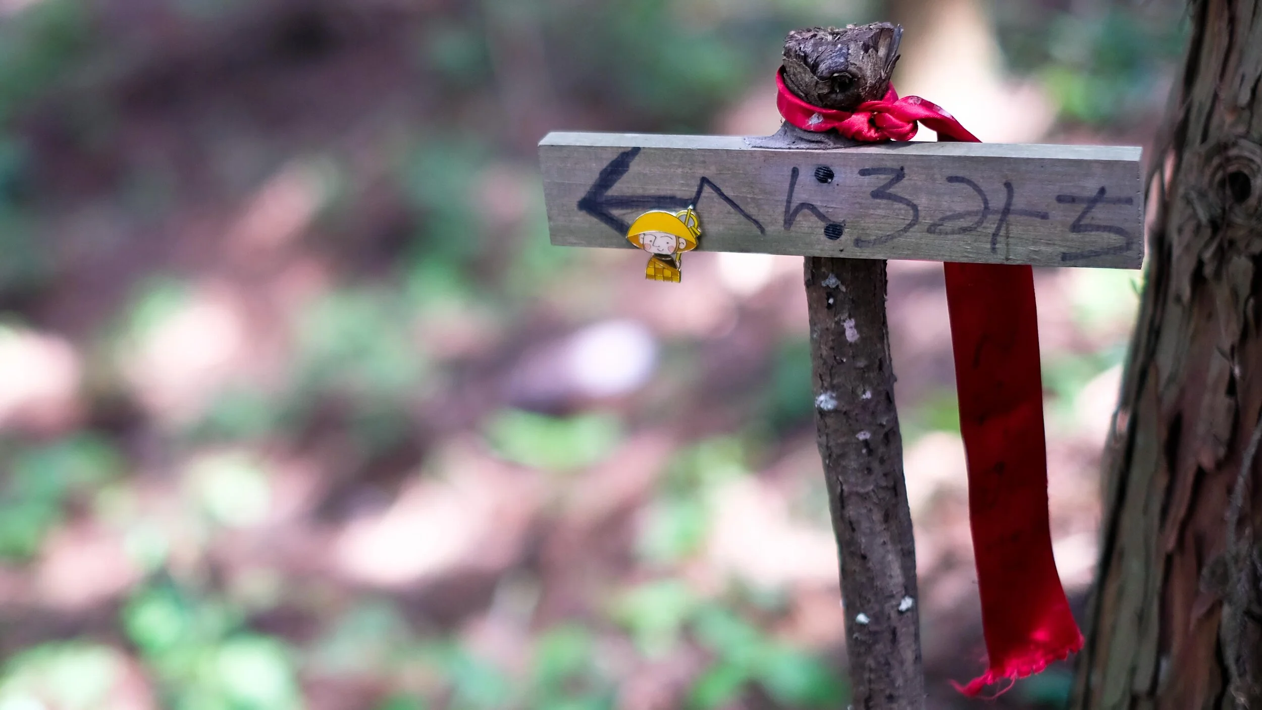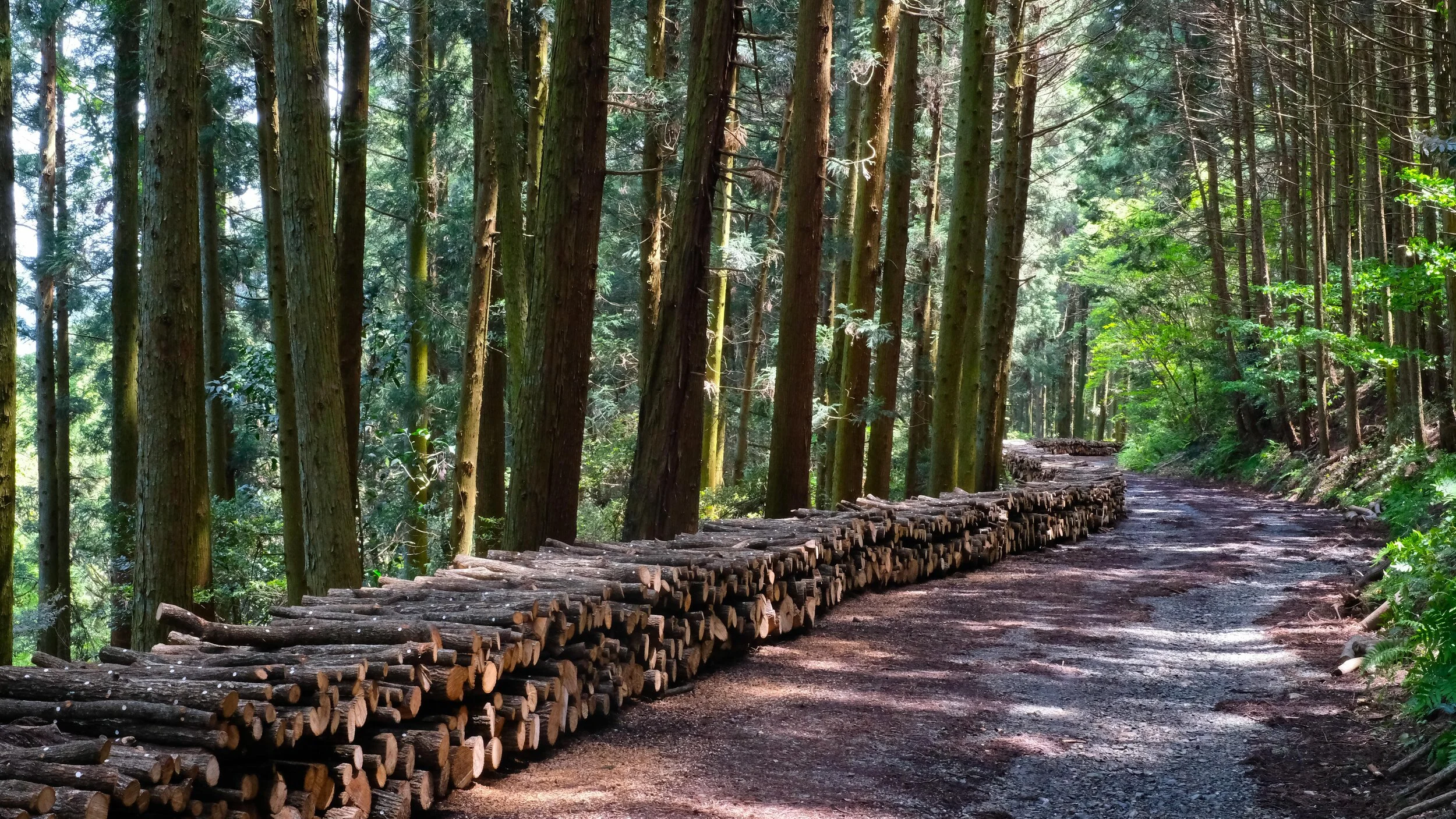 Passing a dog grooming business on the route, a lady ran out to confirm for us that the upcoming nature trail was “OK”, however we should be aware to stay hidari, or to the left. “hidari hidari, always keep hidari” she told us. We vigilantly stayed left. However somehow passed our turn and had to backtrack. Once on the beautiful quiet forest path we continued to watch for markers, which were scarce. Matt picked up one that had fallen to the ground. He left his own addition to it, his osettai pin from Temple 31. As he was repositioning the sign, a Korean pilgrim couple came through, looked at his work and with a thank you vanished into the woods. Further up the trail a large group of workers were stacking cut wood. They were stuffing the holes in the logs with something that looked like styrofoam?