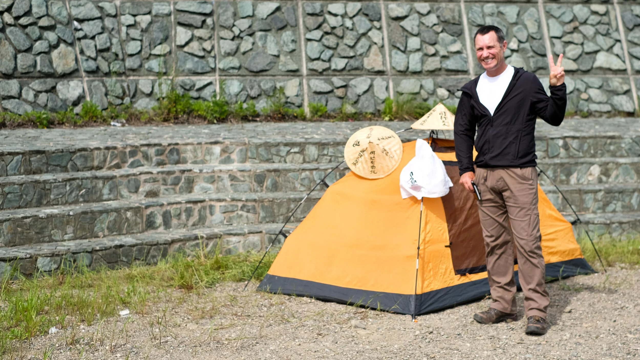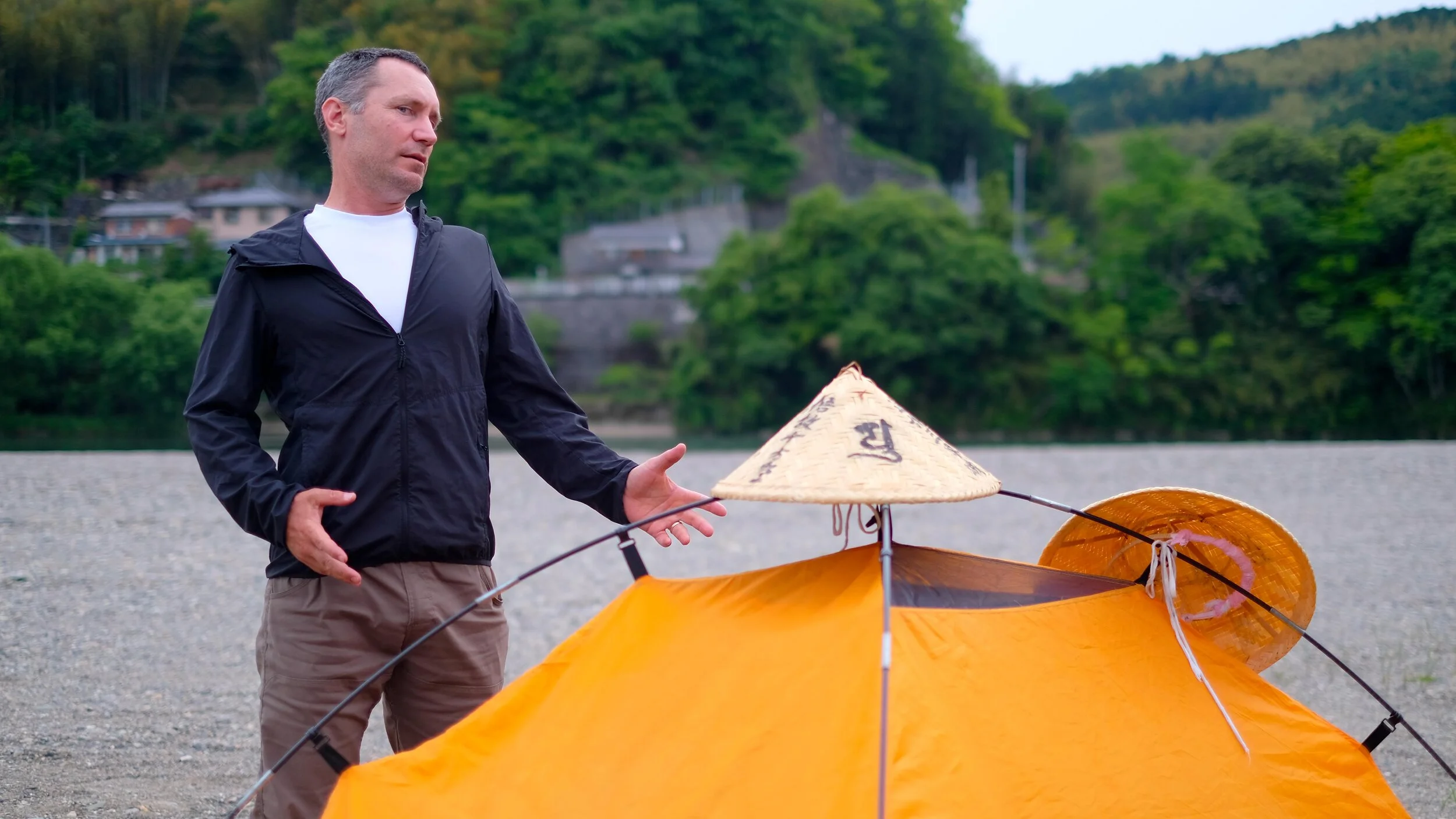 Today 2:00pm would mark the end of our walking day. We found a spot on at the River Side Camp Site and pitched our tent. A handful of families were already BBQ’ing, paddle boarding and fishing on the last days of Golden Week. Unaccustomed to finishing so early, we found ourselves with time to be idle. But idleness is not for people who have spent close to a month walking non-stop. After setting up our tent we went to explore Ozu City. We placed our pilgrim hats on top of the tent and all our belongings inside unsecured. Only in Japan could this scenario work. We soaked our tired feet in the ice cold waters of the river, walked through the antique alleyways of the city, stopped by an old museum with retro cars, and walked up to a hillside shrine. Everyone unwinds at different degrees. For me it takes a little longer sometimes. Visiting all the places we did this afternoon would not necessarily be something I would do on my own. Matts scenarios are always appreciated.